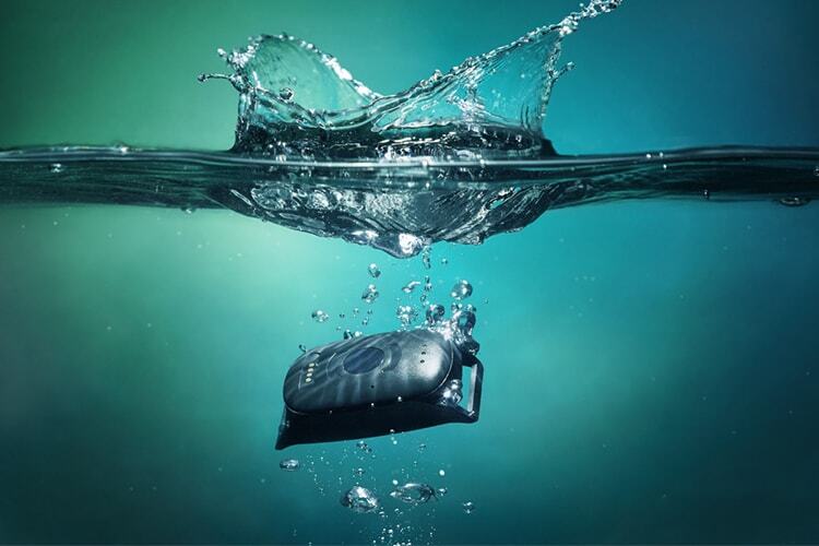 MiniFinder Atto Pro splashed with water. Light blue background and bright orange collar to the Atto Pro.